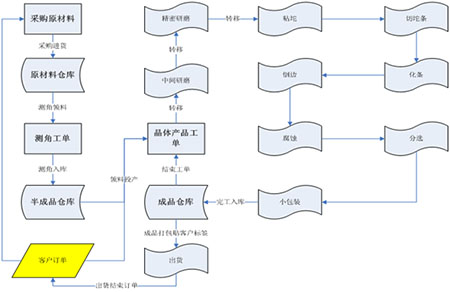 測角工藝對物料角度的分選,分選后對不符合角度的物料需要回倉管理;原材料需要有特征碼(如:角度參數)及特征分類庫存管理。