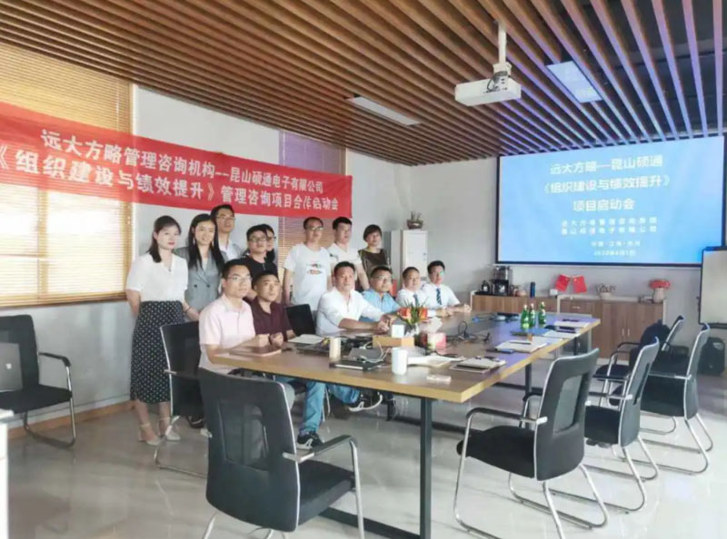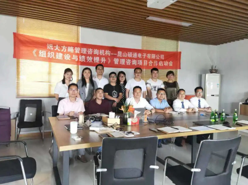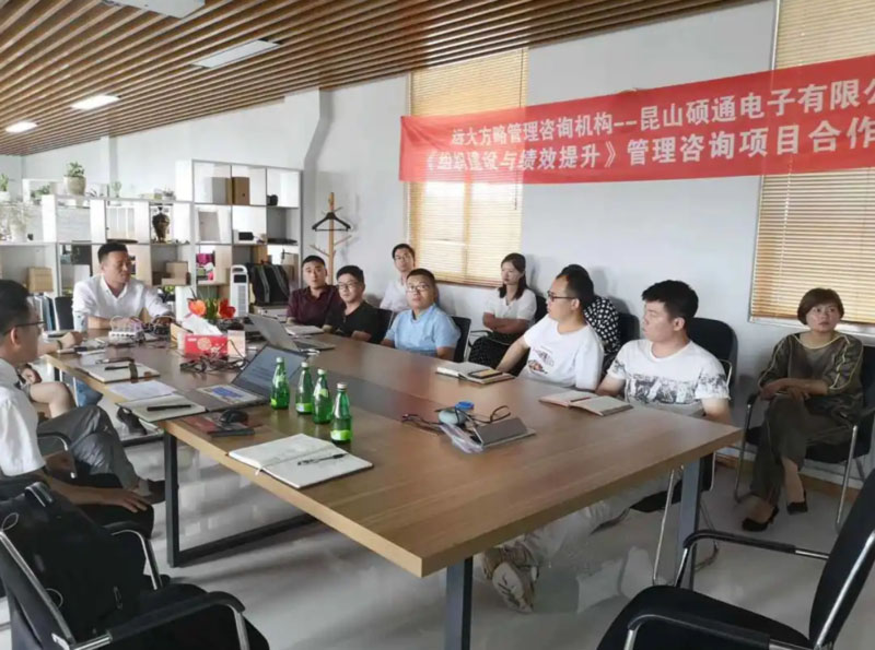 昆山碩通電子有限公司(以下簡稱“碩通電子”)攜手遠大方略啟動《組織建設(shè)與績效提升》管理改善項目。遠大方略項目總監(jiān)劉老師、遠大方略咨詢師呂老師入駐碩通電子,通過前期對碩通電子公司的深入調(diào)研與探討,本期項目主要圍繞企業(yè)現(xiàn)狀診斷、管理者角色轉(zhuǎn)型、組織結(jié)構(gòu)優(yōu)化、崗位職責(zé)優(yōu)化、薪酬體系優(yōu)化、績效體系優(yōu)化、年終獎方案等展開改善。
