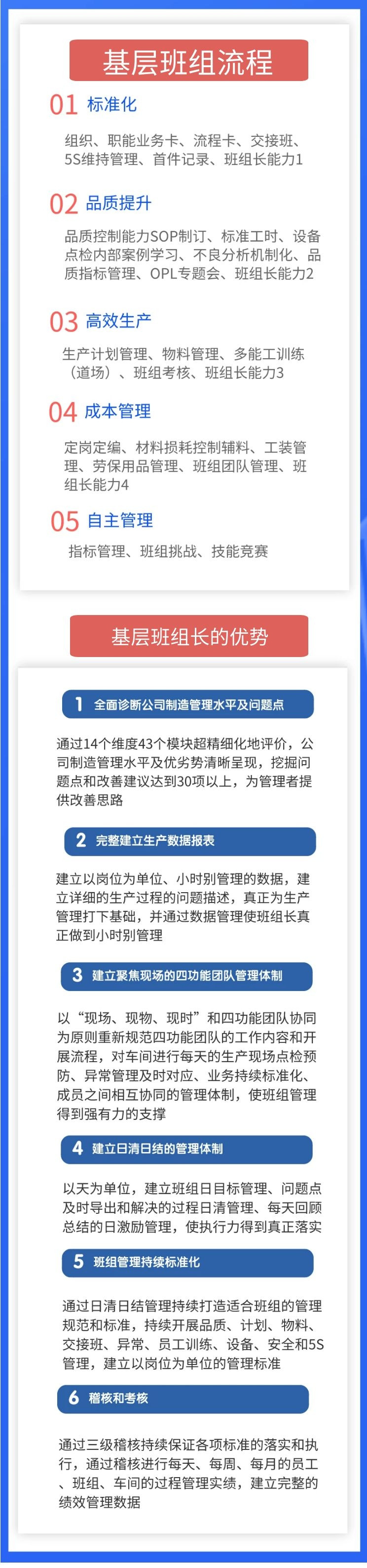 遠(yuǎn)大咨詢集團(tuán)根據(jù)100多家企業(yè)服務(wù)經(jīng)驗開發(fā)基層班組管理咨詢產(chǎn)品。以推進(jìn)班組管理各方面業(yè)務(wù)的標(biāo)準(zhǔn)化開始,從班組管理規(guī)范化開始,逐步推進(jìn)班組的品質(zhì)管理能力,效率管理能力,成本管理能力,逐步達(dá)到班組自主管理的程度。