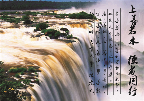 “上善若水。水善利萬物而不爭,處眾人之所惡,故幾于道。居,善地;心,善淵;與,善仁;言,善信;政,善治;事,善能;動,善時。” ——《道德經》第八章