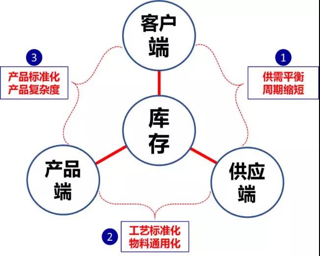 從企業的運營角度看,客戶、產品、供應決定運營的復雜度,直至庫存的復雜度。舉例:保證供需平衡、縮短交付周期,可有效的降低安全庫存持有量;如產品和工藝設計通用化及標準后,產品生產難度就會降低,生產周期就縮短,相應的庫存就下降。