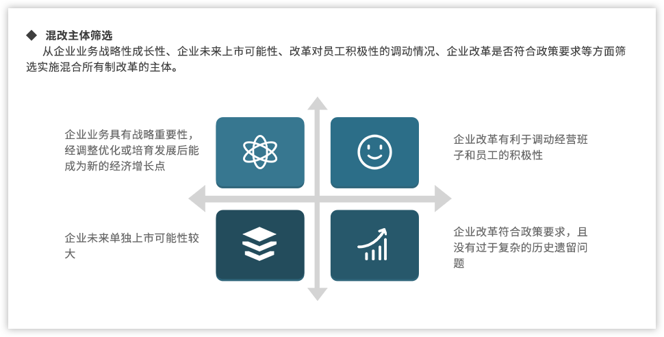 黨的十九大報告指出:“要深化國有企業改革,發展混合所有制經濟,培育具有全球競爭力的世界一流企業”;當前,隨著國企改革“雙百行動”、區域性國資國企綜合改革試驗、“科改示范行動”、第三批以及第四批混改試點的實施,國企改革由點向面梯次鋪開、范圍逐步擴大,并呈現明顯加速,國有企業改革進入“深水區”。追本溯源,國企改革到底怎么改,回到國有企業改革的初衷我們認為,國有企業改革是以混和所有制為手段,在堅持黨的領導下建立現代企業制度,優化管理關系,創新管理機制,激發員工活力,從而最終實現國有企業的持續發展?;旄穆鋵嵉骄唧w實踐中,便處處是難點。遠大方略認為,混改的重點已經從以“政策研究+方案制定”為主轉變到以化解落地過程中的實際痛點為主,從剖析“為什么混、和誰混、怎么混”轉變為落實治理結構、戰略協同以及激勵機制等深層次問題。