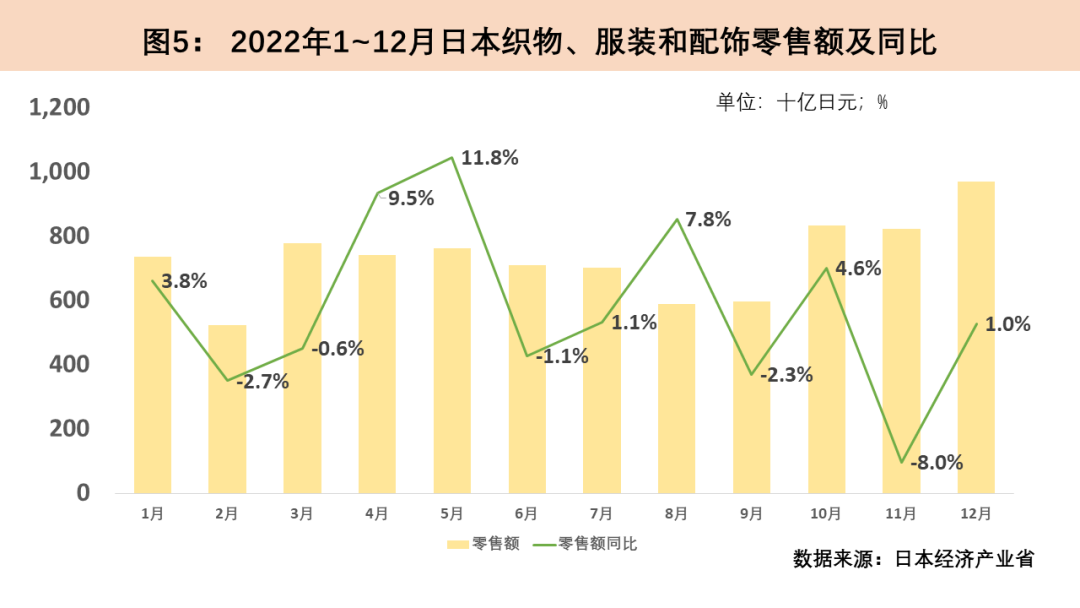2022年日本紡織品服裝零售額受疫情反復而波動。2022年初日本受到奧密克戎病毒的沖擊,2月紡織品服裝零售環比驟降29.3%,同比下滑2.7%。2022年3月日本全面解除疫情管控措施,紡織品服裝零售額于4月增速由負轉正,5月同比增速達11.8%。2022年7至9月日本迎來第二輪疫情高峰,7月以來日本紡織品服裝零售額連續三月下降。10月,日本解除入境限制并對國內旅游發放補貼,經濟刺激政策下服裝消費開始穩步回升,12月日本紡織品服裝零售額環比上漲18.5%。