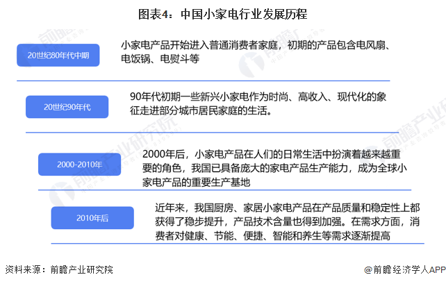 中國(guó)小家電行業(yè)發(fā)展歷程可以分為四個(gè)階段,20世紀(jì)80年代中期小家電產(chǎn)品開(kāi)始進(jìn)入普通消費(fèi)者家庭,初期的產(chǎn)品包含電風(fēng)扇、電飯鍋、電熨斗等;20世紀(jì)90年代新興小家電作為時(shí)尚的象征開(kāi)始走入城市居民生活;2000年后,小家電產(chǎn)品在人們的日常生活中扮演著越來(lái)越重要的角色,中國(guó)也開(kāi)始成為小家電重要的生產(chǎn)基地;2010年后,產(chǎn)品質(zhì)量和穩(wěn)定性穩(wěn)步提高,健康、節(jié)能、便捷、智能和養(yǎng)生等需求也刺激行業(yè)進(jìn)一步發(fā)展。目前行業(yè)進(jìn)入多品類、高質(zhì)量、智能化的全新階段。