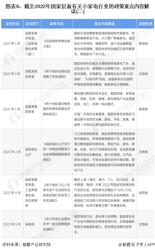2022年1月,國(guó)家發(fā)改委擬定《關(guān)于做好近期促進(jìn)消費(fèi)工作的通知》,鼓勵(lì)有條件的地方開(kāi)展綠色智能家電下鄉(xiāng),通過(guò)企業(yè)讓利、降低首付比例等方式,促進(jìn)農(nóng)村居民消費(fèi)。支持家電、家具等企業(yè)開(kāi)展“以舊換新”、“以換代棄”活動(dòng),加強(qiáng)家電安全使用年限標(biāo)準(zhǔn)等宣傳解讀,鼓勵(lì)家電合理更新。2022年一季度,中國(guó)境內(nèi)零星爆發(fā)新型冠狀肺炎疫情導(dǎo)致經(jīng)濟(jì)增長(zhǎng)受阻,國(guó)務(wù)院也于2022年5月制定了一攬子穩(wěn)住經(jīng)濟(jì)的政策措施,其中提及穩(wěn)定家電產(chǎn)品的消費(fèi)。總結(jié)梳理來(lái)看,近年來(lái)國(guó)家層面對(duì)于小家電行業(yè)的政策關(guān)鍵詞在于:新一輪家電下鄉(xiāng)、以舊換新、補(bǔ)貼消費(fèi)、家電回收。