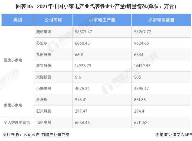 2021年,布局了小家電制造的上市企業(yè)中,美的集團(tuán)、蘇泊爾、九陽(yáng)股份、新寶股份、小熊電器、飛科電器的企業(yè)產(chǎn)量均在4000萬(wàn)臺(tái)以上,規(guī)模較大,其中美的集團(tuán)家電產(chǎn)品產(chǎn)量達(dá)到5.85億臺(tái),產(chǎn)量規(guī)模位居全國(guó)第一。從產(chǎn)銷率來(lái)看,多數(shù)企業(yè)基本達(dá)到產(chǎn)銷平衡的狀態(tài),蘇泊爾呈現(xiàn)供不應(yīng)求的局面,其部分產(chǎn)能需要通過(guò)代工方式進(jìn)行補(bǔ)充。小家電產(chǎn)業(yè)的代表性企業(yè)產(chǎn)量/銷量情況如下: