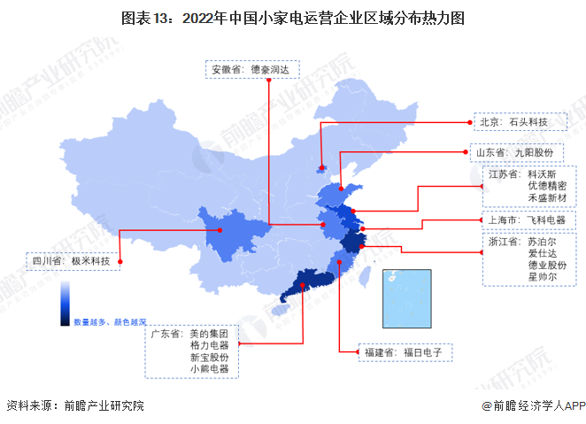 截至2022年6月中旬,根據(jù)中國(guó)企業(yè)數(shù)據(jù)庫(kù)企查貓,目前中國(guó)小家電行業(yè)的主要企業(yè)共有4348家,從企業(yè)主體注冊(cè)地分布來(lái)看,中國(guó)小家電企業(yè)主要分布在珠三角及華東區(qū)域,特別以廣東和浙江為代表,目前廣東共有相關(guān)小家電企業(yè)數(shù)2113家,浙江則有1654家。而從小家電產(chǎn)業(yè)鏈相關(guān)上市企業(yè)分布情況來(lái)看,兩地也是聚集了眾多的企業(yè),如廣東的美的集團(tuán)、格力電器、新寶股份、小熊電器,浙江的蘇泊爾、愛(ài)仕達(dá)、德業(yè)股份等。