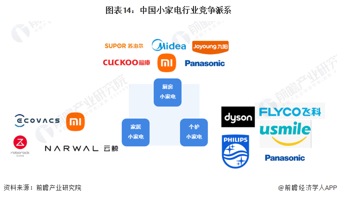 根據(jù)各市場(chǎng)主體主營(yíng)產(chǎn)品的類型差異,中國(guó)小家電行業(yè)可以劃分為三個(gè)競(jìng)爭(zhēng)派系。廚房小家電領(lǐng)域的主要參與者有美的集團(tuán)、蘇泊爾、九陽(yáng)股份、松下電器等;家居小家電產(chǎn)品主要包括掃地機(jī)器人、洗地機(jī)、無(wú)線吸塵器等產(chǎn)品,參與者包括科沃斯、石頭科技、小米科技、云鯨等品牌;個(gè)護(hù)小家電產(chǎn)品主要包括電吹風(fēng)、電動(dòng)剃須刀、電動(dòng)牙刷等產(chǎn)品,市場(chǎng)參與者包括戴森、飛利浦、飛科電器、松下電器、USMILE等。