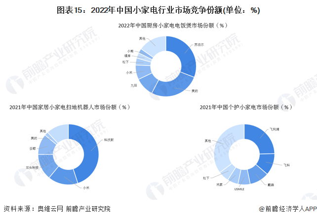 綜合來(lái)看,目前中國(guó)小家電行業(yè)龍頭企業(yè)是美的集團(tuán),其小家電業(yè)務(wù)營(yíng)收規(guī)模遙遙領(lǐng)先,但具體至三個(gè)競(jìng)爭(zhēng)派系中佼佼者各異。廚房小家電(以首要產(chǎn)品電飯煲為例)領(lǐng)域,2022年前4個(gè)月,蘇泊爾市場(chǎng)份額達(dá)到30.9%,占據(jù)第一;美的集團(tuán)、九陽(yáng)股份位列第二、三名,市場(chǎng)份額分別為26.8%及10.2%。家居小家電(以首要產(chǎn)品掃地機(jī)為例)領(lǐng)域,2021年,科沃斯憑借旗下科沃斯掃地機(jī)器人及添可洗地機(jī)良好的市場(chǎng)口碑,占據(jù)了家居小家電領(lǐng)域45%的市場(chǎng)份額;小米科技、石頭科技市場(chǎng)份額分別為16%及14%。在個(gè)護(hù)小家電領(lǐng)域,2021年飛利浦占據(jù)了24.6%市場(chǎng)份額排名第一,飛科電器及戴森分別占據(jù)11.7%及10.5%的市場(chǎng)份額。