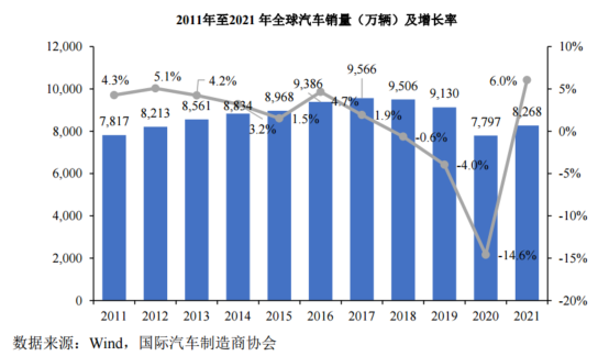 2020年,全球汽車市場低迷,汽車銷量下降至7,797萬輛,隨著經(jīng)濟(jì)形勢逐步好轉(zhuǎn),汽車市場逐漸回暖,2021年全球汽車銷量約8,268萬輛。