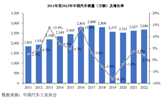根據(jù)中國汽車工業(yè)協(xié)會(huì)統(tǒng)計(jì),2022年,中國汽車銷量約2,686萬輛,同比增長2.1%。