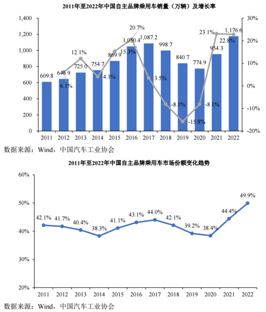 根據(jù)中國汽車工業(yè)協(xié)會(huì)統(tǒng)計(jì),2022年,中國乘用車銷量約2,356.3萬輛,增速達(dá)到9.5%,創(chuàng)近六年來新高。其中,自主品牌乘用車銷量約1,176.6萬輛,占乘用車市場份額約49.9%,實(shí)現(xiàn)大幅增長。