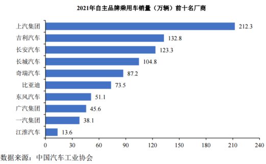 根據(jù)中國汽車工業(yè)協(xié)會(huì)統(tǒng)計(jì),2021年中國自主品牌乘用車銷量前十名廠商分別為:上汽集團(tuán)、吉利汽車、長安汽車、長城汽車、奇瑞汽車、比亞迪、東風(fēng)汽車、廣汽集團(tuán)、一汽集團(tuán)和江淮汽車,合計(jì)銷售乘用車882.3萬輛,占自主品牌乘用車銷量占比約92.46%,在中國乘用車總銷量中占比約41.07%。