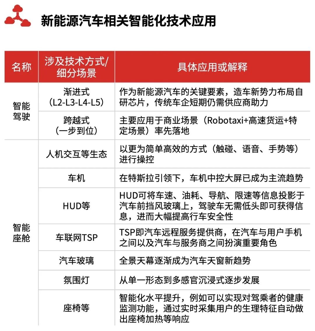 新能源汽車涉及的相關智能化應用非常繁雜,但具體歸類可將其簡要分為智能駕駛相關應用與智能座艙相關應用兩大分類;具體細分上,智能駕駛分為漸進式與跨越式兩種形態,智能座艙包括人機交互、車機、HUD等細分應用。