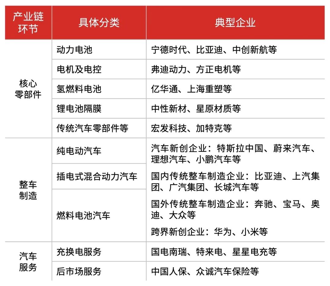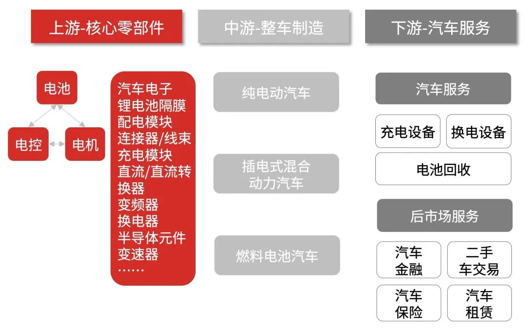 新能源汽車行業的產業鏈主要由核心零部件(上游)、整車制造(中游)、汽車服務(下游)組成。