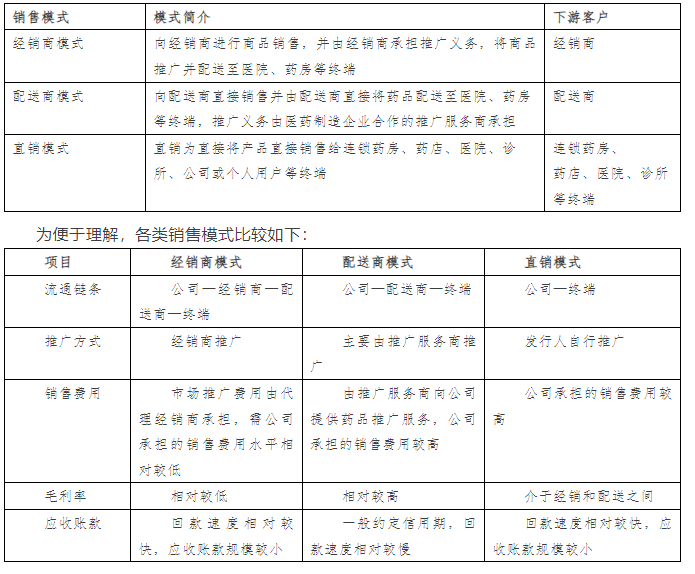醫藥制造企業的銷售模式包括經銷商模式、配送商模式、直銷模式,其主要區別在于推廣方式及銷售費用的承擔。具體情況如下: