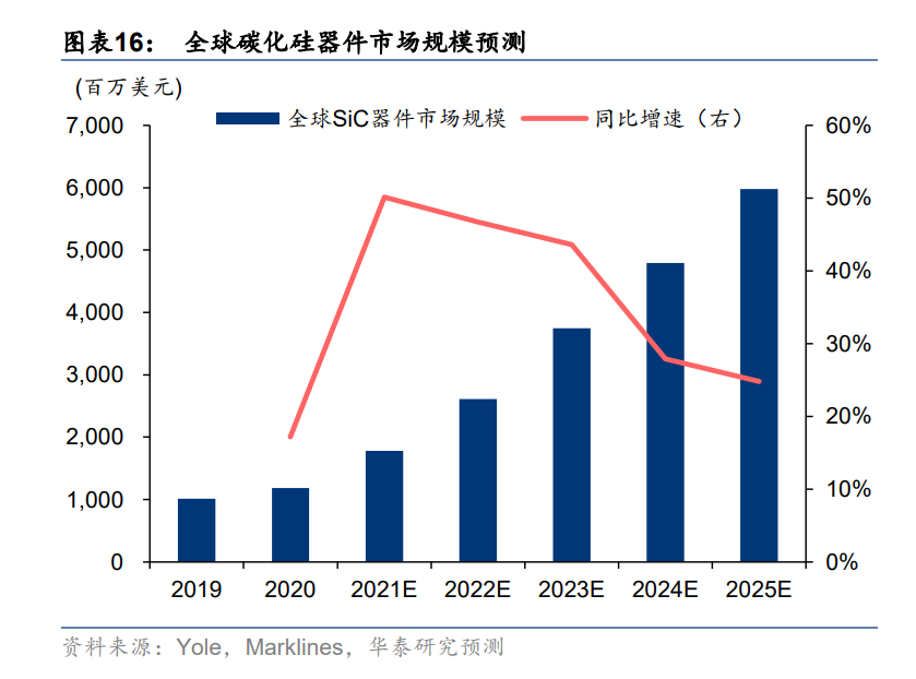 2020 年全球 SiC 器件市場規模達 11.84 億美元,預計到 2025 年有望增長至 59.79 億美元,對應復合年均增長率為 38.2%。根據測算,在碳中和趨勢下,受益于 SiC 在新能源汽車、光 伏、風電、工控等領域的持續滲透,SiC 功率器件市場規模有望從 2020 年的 2.92 億美元增長至 2025 年的 38.58 億美元,對應復合年均增長率為 67.6%;以及在5G通信、下游SiC功率及射頻器件高速增長的需求也將帶動 SiC 材料市場規模快速成長。