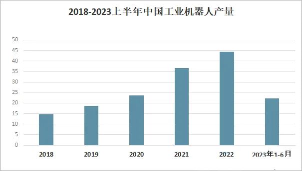 隨著我國傳統(tǒng)工業(yè)特別是制造業(yè)的迅速發(fā)展,國內(nèi)對于生產(chǎn)勞動力的需求量逐步提升。傳統(tǒng)工業(yè)尤其是制造業(yè)對工業(yè)機(jī)器人這類勞動力替代產(chǎn)品的需求將始終保持增長態(tài)勢。工業(yè)機(jī)器人按照輸入信號方式可分為編程輸入型機(jī)器人和示教輸入型機(jī)器人。從國家統(tǒng)計局發(fā)布的數(shù)據(jù)來看,我國工業(yè)機(jī)器人產(chǎn)量整體呈現(xiàn)穩(wěn)定增長的趨勢,且增速逐年增加,2022年我國工業(yè)機(jī)器人產(chǎn)量為44.31萬套,比2021年增加了7.71萬套,同比增加21.07%,截至2023年6月底,我國工業(yè)機(jī)器人產(chǎn)量為22.21萬套,同比增長5.4%,預(yù)計2023年底,我國工業(yè)機(jī)器人產(chǎn)量將突破45萬套。