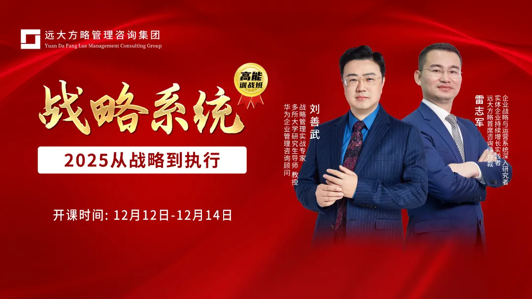 為幫助企業掃清戰略迷霧,遠大方略每年都會推出戰略系統課程,10月戰略課程現場爆滿,11月21日-23日再次舉行《戰略系統-2025從戰略到執行》課程,現場依舊火熱。本次課程由華為企業管理咨詢顧問劉善武老師全程授課,通過深入剖析戰略的本質與執行的精髓,為學員們提供一套從戰略制定到高效執行的系統性方法論,幫助企業實現戰略性增長。